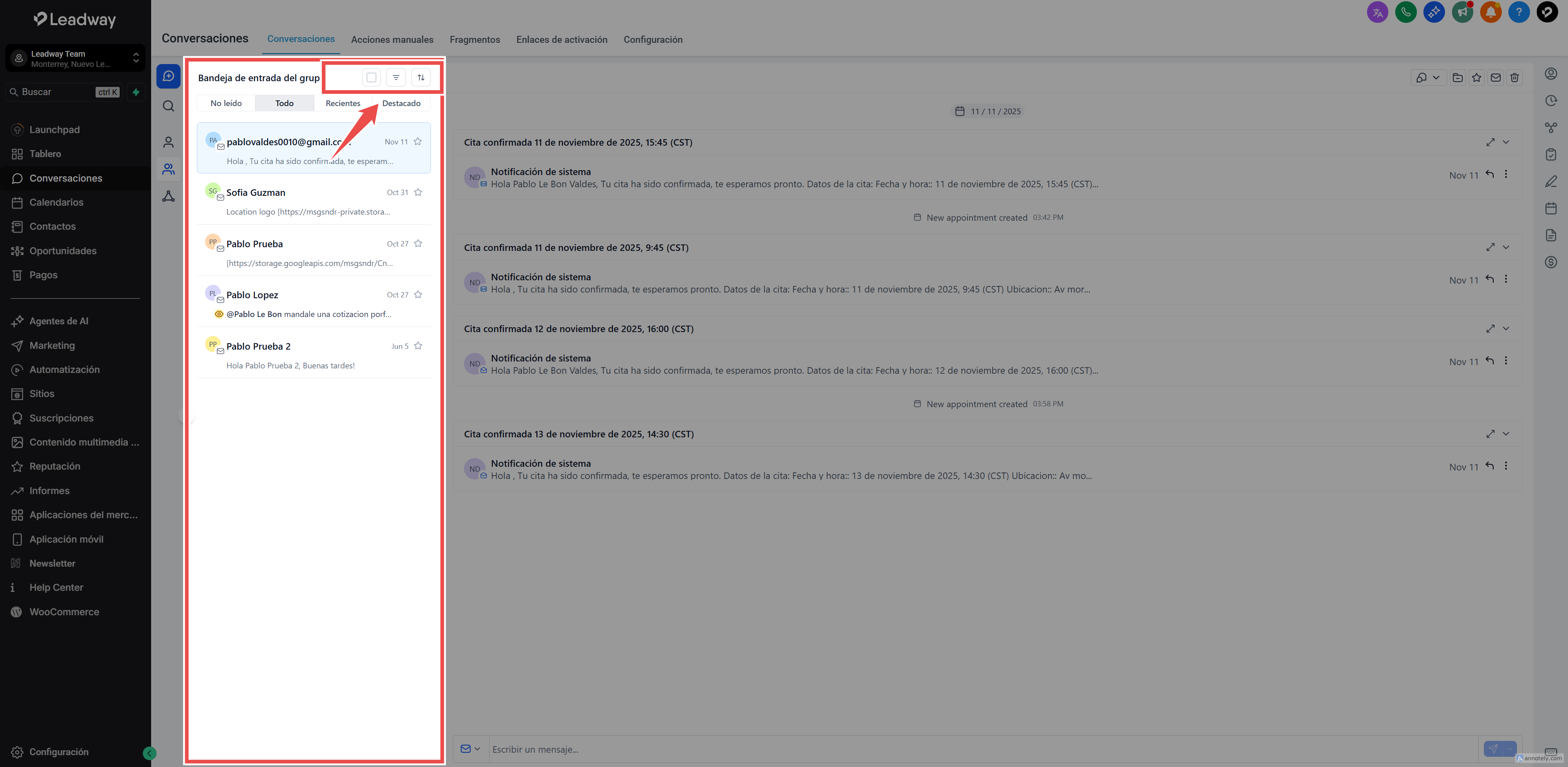 La nueva experiencia rediseñada de Conversaciones en Leadway ofrece una bandeja de entrada más rápida, clara y flexible. Incluye cuatro paneles configurables, filtros avanzados (incluyendo etiquetas con lógica AND/OR) y un compositor de email moderno.