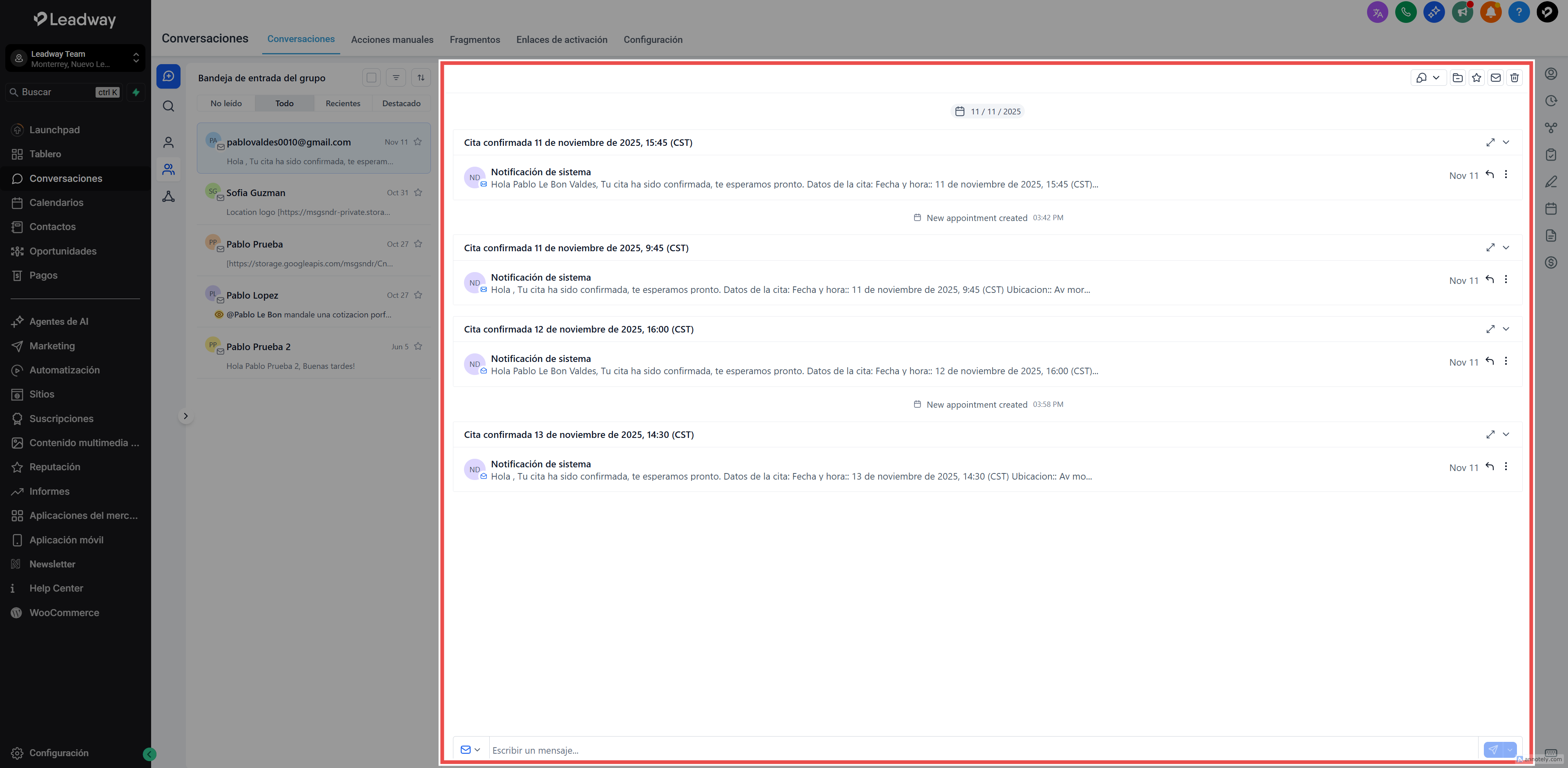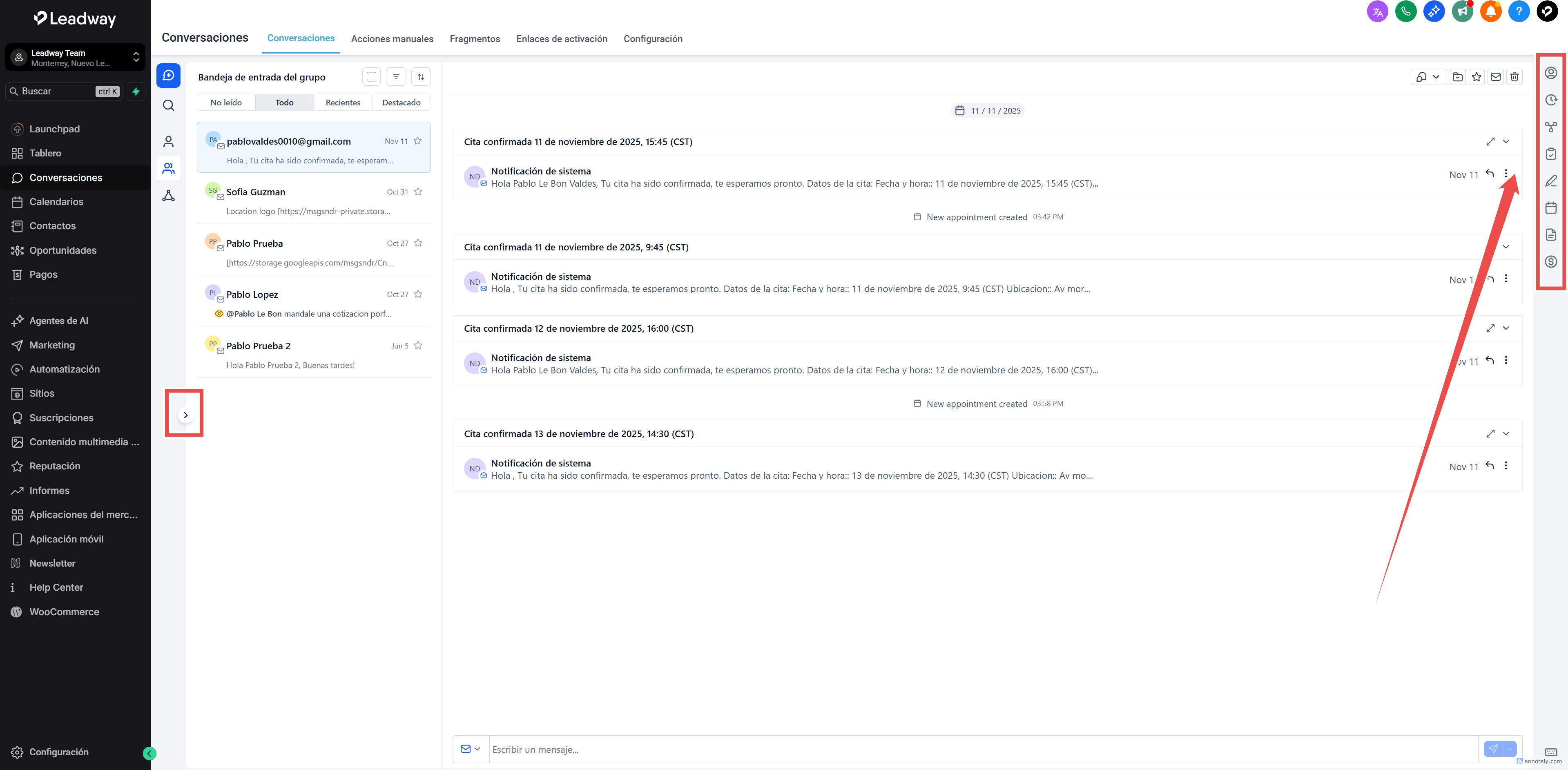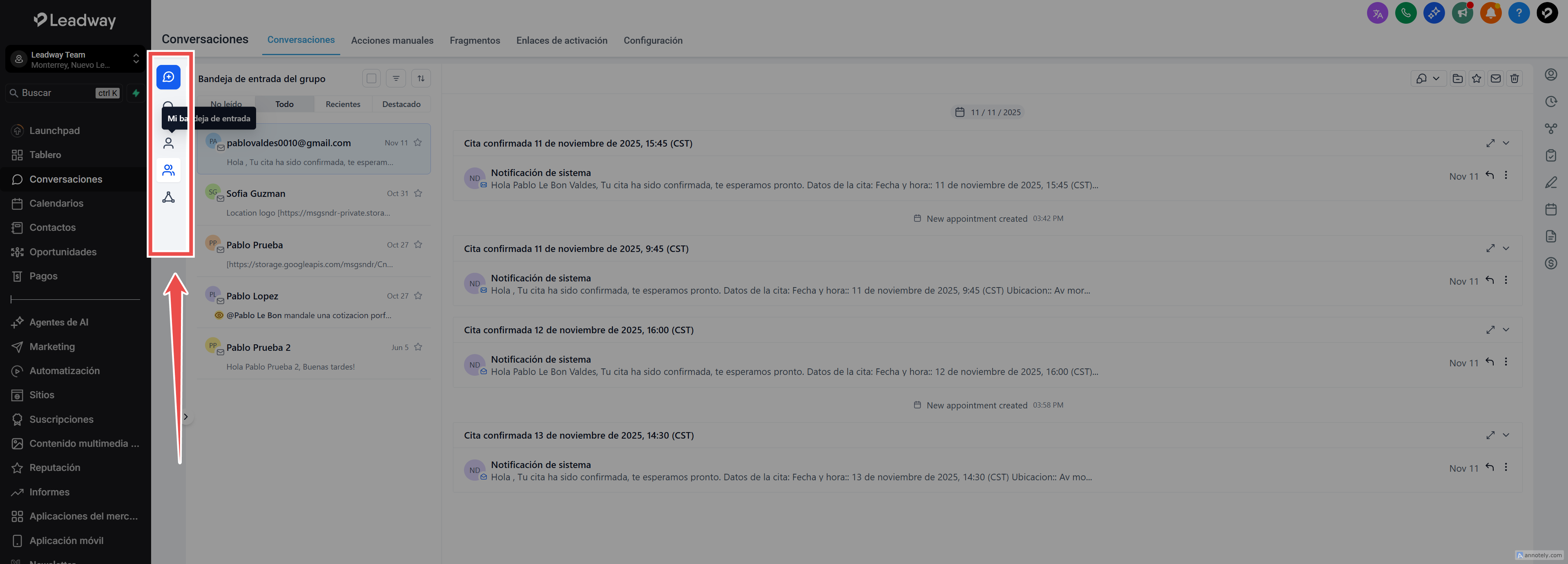 Todas las conversaciones dentro de la cuenta