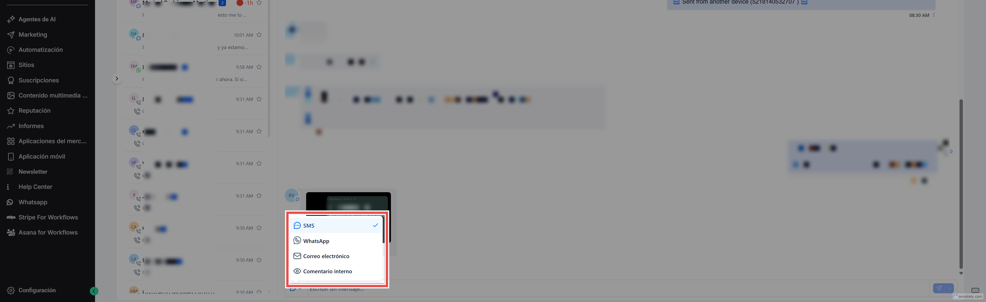 Puedes elegir el canal más adecuado para cada respuesta sin salir del hilo de conversación. Esto es ideal para mover una conversación de SMS a email, responder por WhatsApp o agregar notas internas sin interrumpir tu flujo de trabajo.