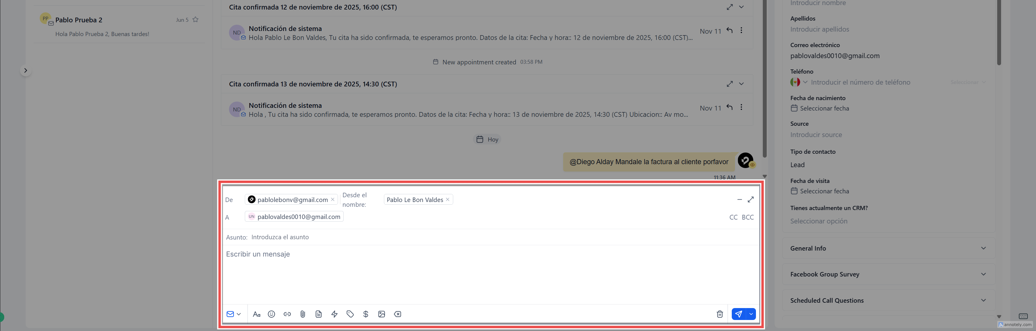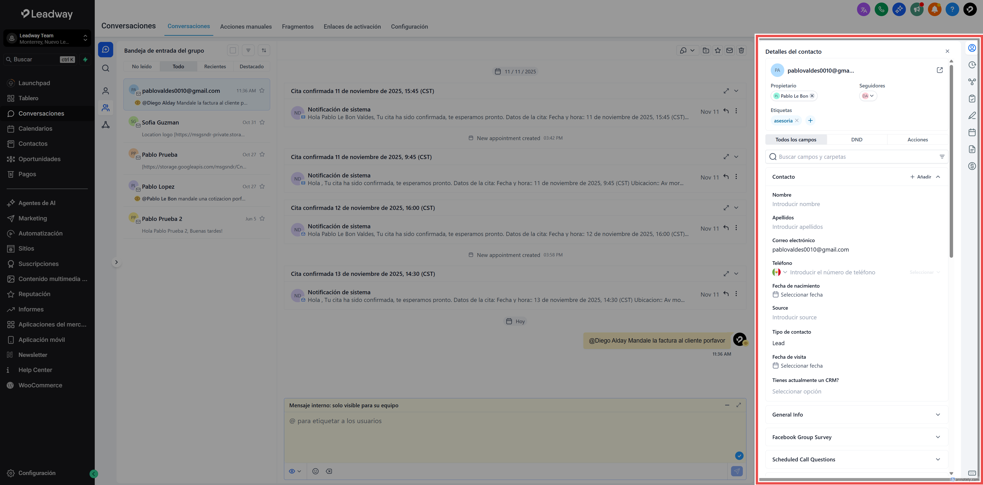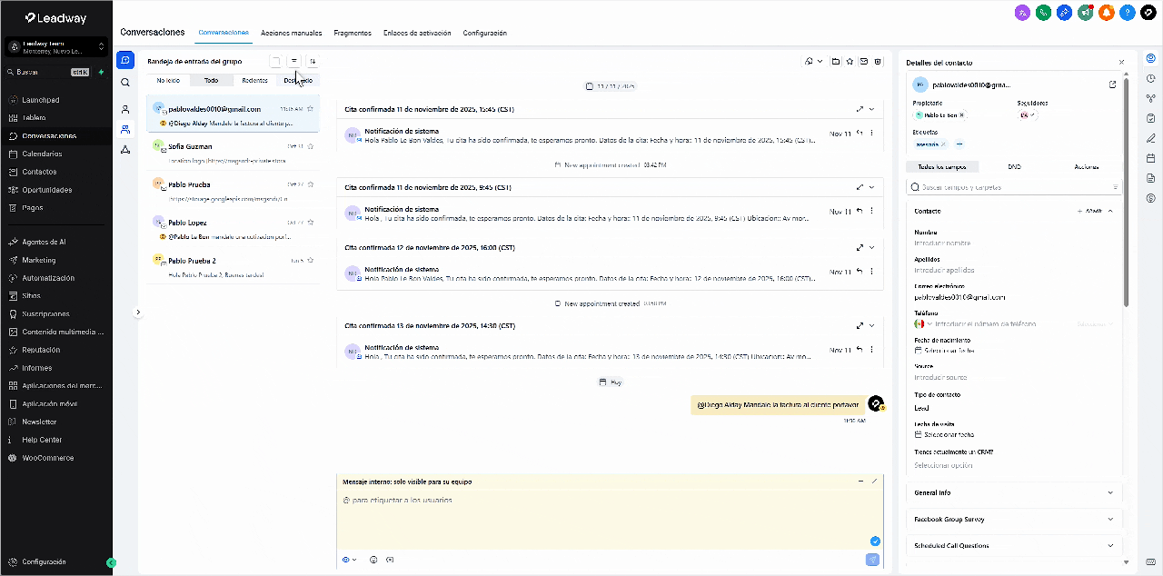Todo lo que antes solo estaba disponible en la página de Contactos —incluyendo campos personalizados, carpetas y acciones— ahora está integrado directamente en este panel, ofreciéndote control total mientras interactúas con un cliente.