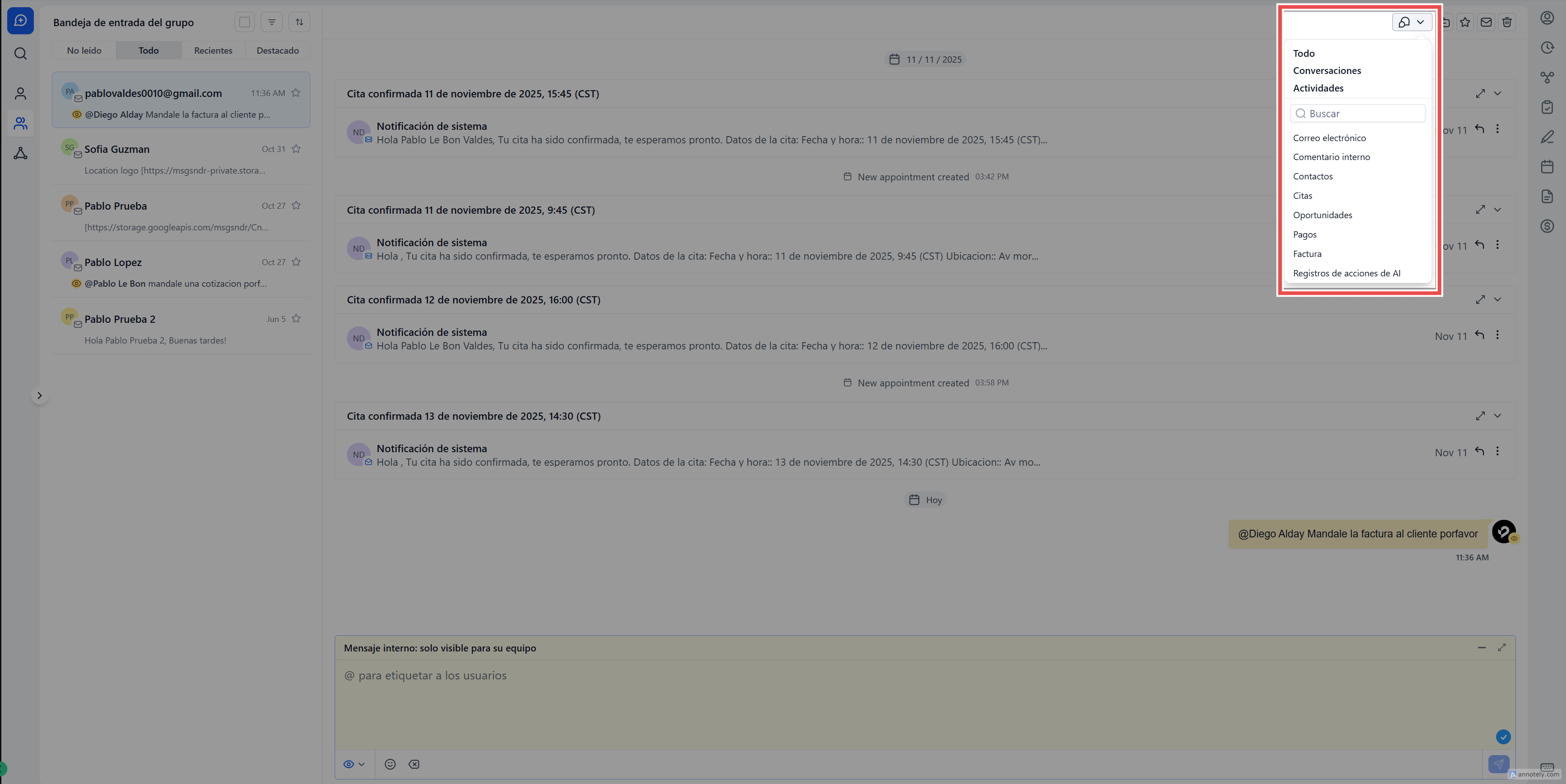 El Panel de Bandeja de Entrada controla qué conjunto de conversaciones estás visualizando —personales, del equipo o chats internos— lo que te permite cambiar de contexto rápidamente sin salir de la página.